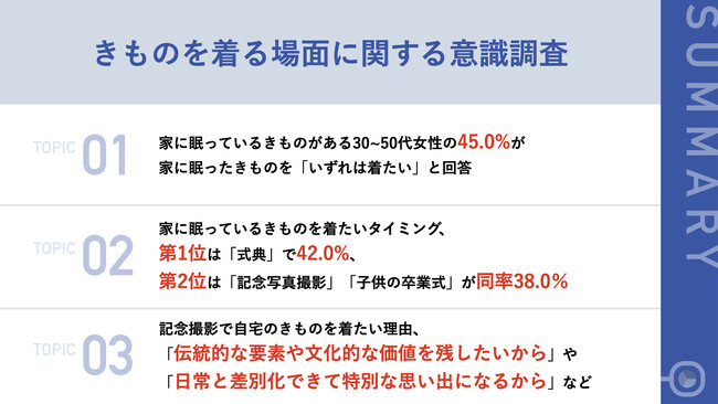 30~50代女性の45.0%が、家に眠ったきものを「いずれは着たい」と回答。着たいタイミングは「式典」や「記念写真撮影」などが上位に