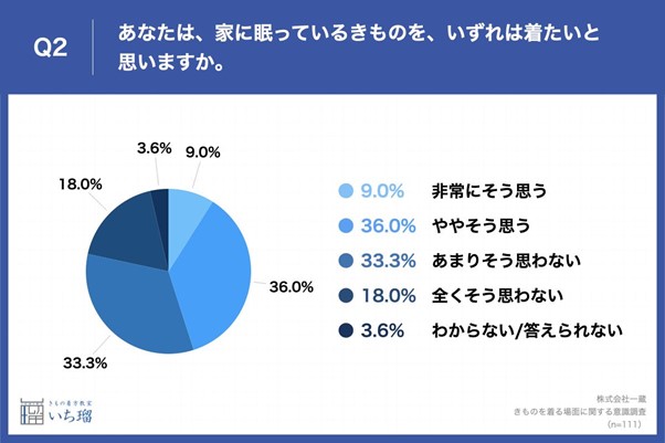 「Q2.あなたは、家に眠っているきものを、いずれは着たいと思いますか。」と質問したところ、「非常にそう思う」が9.0%、「ややそう思う」が36.0%という回答となりました。