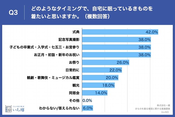 Q2で「非常にそう思う」「ややそう思う」と回答した方に、「Q3.どのようなタイミングで、自宅に眠っているきものを着たいと思いますか。(複数回答)」と質問したところ、「式典」が42.0%、「記念写真撮影」が38.0%、「子どもの卒業式・入学式・七五三・お宮参り」が38.0%という回答となりました。