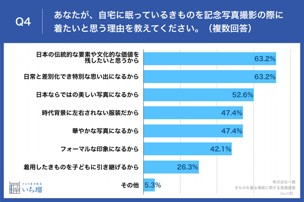 Q3で「記念写真撮影」と回答した方に、「Q4.あなたが、自宅に眠っているきものを記念写真撮影の際に着たいと思う理由を教えてください。(複数回答)」と質問したところ、「日本の伝統的な要素や文化的な価値を残したいと思うから」が63.2%、「日常と差別化でき特別な思い出になるから」が63.2%、「日本ならではの美しい写真になるから」が52.6%という回答となりました。