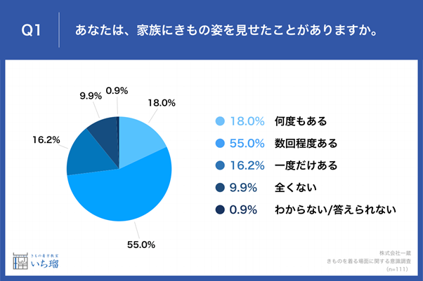「Q1.あなたは、家族にきもの姿を見せたことがありますか。」と質問したところ、「何度もある」が18.0%、「数回程度ある」が55.0%という回答となりました。