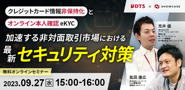 企業と顧客をつなぐDXクラウドサービスを展開する株式会社ショーケース(東京都港区、代表取締役社長:永田豊志、証券コード:3909、以下ショーケース)は、株式会社 DTS(東京都中央区、代表取締役社長:北村友朗、証券コード:9682、以下DTS)と共催で、「加速する非対面取引市場における最新セキュリティ対策 ~クレジットカード情報非保持化とオンライン本人確認(eKYC)~」と題した無料オンラインセミナーを9月27日(水)に開催いたします。