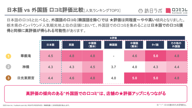 日本語の口コミと比べると、外国語の口コミ(韓国語を除く)では ★評価は同程度~やや高い傾向となりました。栃木県のインバウンド人気観光地上位の店舗において、外国語での口コミを集めることは日本語での口コミ獲得と同様に高評価が得られる可能性があります。
