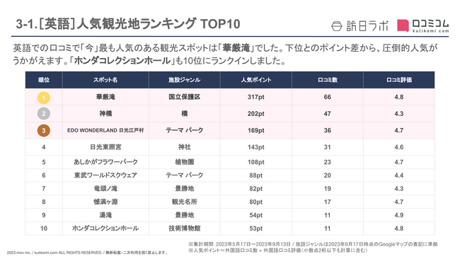 英語での口コミで「今」最も人気のある観光スポットは「華厳滝」でした。下位とのポイント差から、圧倒的人気がうかがえます。「ホンダコレクションホール」も10位にランクインしました。