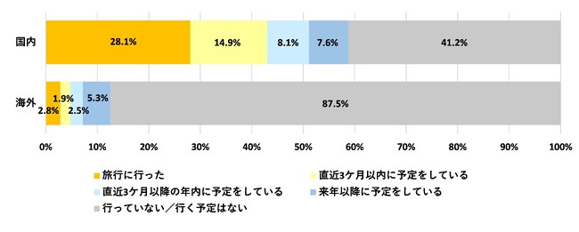 新型コロナウイルス感染症の感染症法上の位置付けが5類に移行した2023年5月以降、旅行をしたか尋ねたところ、約3割の方が国内旅行をしたと回答しました。また、直近3ケ月以内に旅行を予定していると答えた方も14.9%に上り、旅行需要の回復傾向がうかがえます。一方、海外旅行をしたと答えた方は2.8%と少なく、まだハードルがあることが分かります。