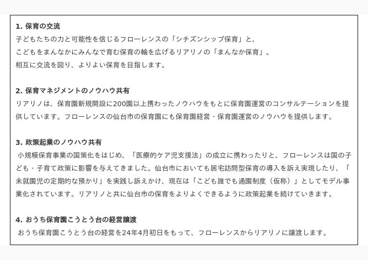 認定NPO法人フローレンス(東京都千代田区、代表理事:赤坂緑)と株式会社リアリノ(本社:大阪府大阪市、代表取締役社長:橋本浩一)は、保育事業のさらなる質の向上、仙台市における子ども・子育て課題の解決を目的とし、保育事業包括的パートナーシップ協定を締結したことをお知らせいたします。