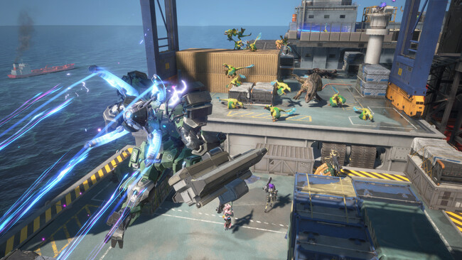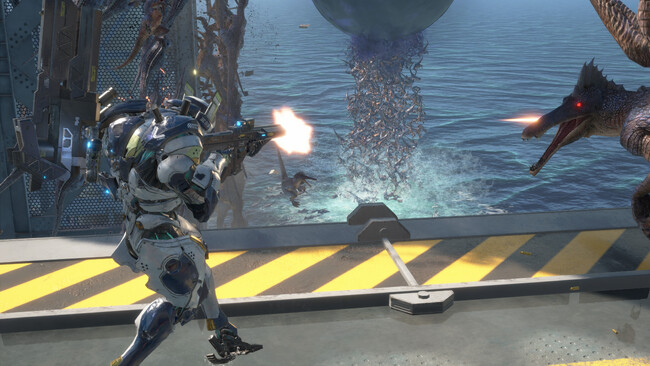 また、海上に浮かぶ高低差がある施設で、恐竜との激しいバトルが繰り広げられる新フィールド「海洋プラント」や、相手チームと協力して10人で目標の達成を目指すファイナルミッション「エスケープ」が新登場。そして、2つのリグ「エッジストライク」と「ドローン」が追加され、エグゾスーツとの組み合わせで様々な戦闘状況に対応することが可能に!