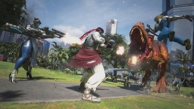 「ストリートファイター」をモチーフとしたスーツスキン、デカール、チャーム、スタンプやエモートが追加。ディノサバイバルを規定回数プレイしたり、有料のコラボコスメセットを購入したりすることで入手可能。コラボアイテムを装備して、俺より強いやつに会いに行こう!