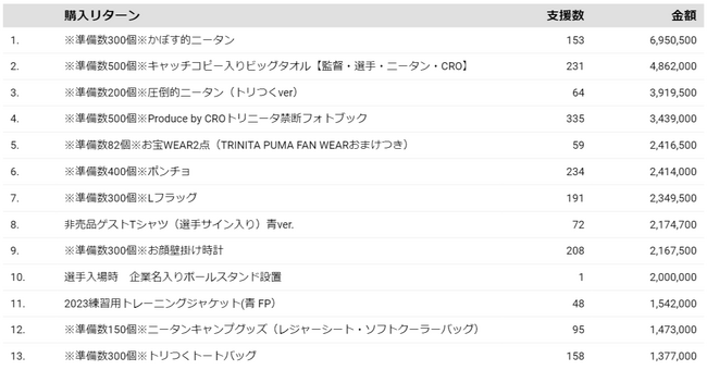 ▼支援募集期間を通じたリターン品ごとの支援数・支援金額