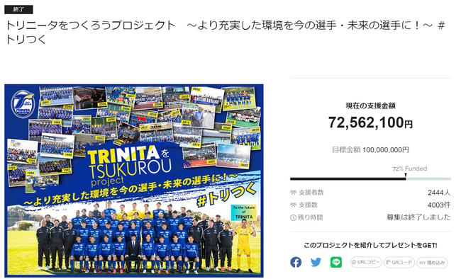 チーム・団体やアスリートを支援するスポーツ専門クラウドファンディングを展開するスポチュニティ株式会社(東京都中央区、以下スポチュニティ)と、J2クラブの大分トリニータを運営する株式会社大分フットボールクラブ(本社:大分県大分市、代表取締役小澤正風、以下大分FC)が実施するクラウドファンディングプロジェクトは、8月31日に終了しました。同プロジェクトは、目標金額の1億円には届きませんでしたが、最終日に3,300万円もの支援を獲得し、72,562,100円の支援金額を獲得して終了しました。