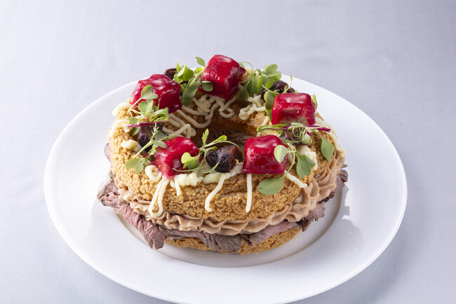 ローストビーフ、マロンクリーム、マッシュポテトをシュー生地でサンドし、クリスマスリースに見立てた華麗な装いです。ポルト酒で煮込んだいちじく、オレンジの風味を纏ったビーツのピューレでコーティングした濃厚な味わいのフォアグラのテリーヌをトッピングしました。