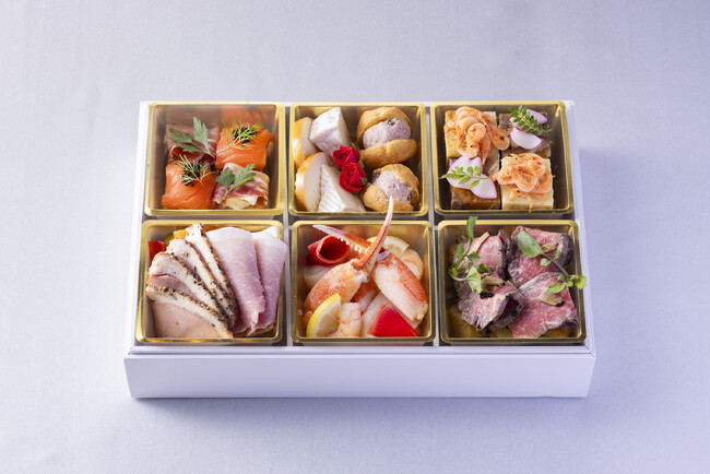 「和牛のローストビーフ トリュフポテト添え」や、「桜海老のキッシュ」、「牛たんのゼリー寄せ」、「蟹のシーフードマリネ」、「 スモークサーモン&生ハム」、「ジャンボンブランと鴨肉のパストラミの盛り合わせ」など、多彩な味わい6品を詰め合わせました。シャンパンやワインはもちろん、日本酒と合わせてもお楽しみいただけます。