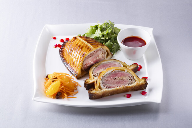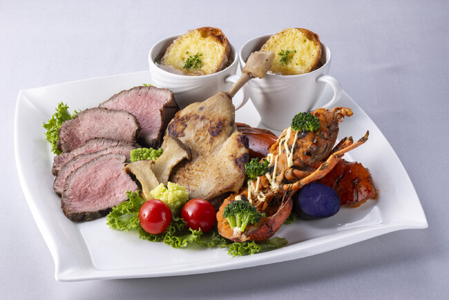 低温でしっとりと仕上げた 「骨付き鴨肉のコンフィ」やたまねぎの甘味を引き出した「オニオングラタンスープ」、オマール海老1尾を豪快に焼き上げた「オマール海老のテルミドール」、ジューシーな「宮城県産日高見牛のローストビーフ」の4品をバリエーション豊かに盛り合わせました。