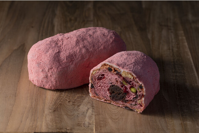 いちごテイストの生地に、クランベリーとブルーベリーのドライフルーツ、ピスタチオ、ウォールナッツを加えたフルーティーなシュトーレン。鮮やかなピンク色で、ほのかな甘さと爽やかないちごの香りが口いっぱいに広がります。