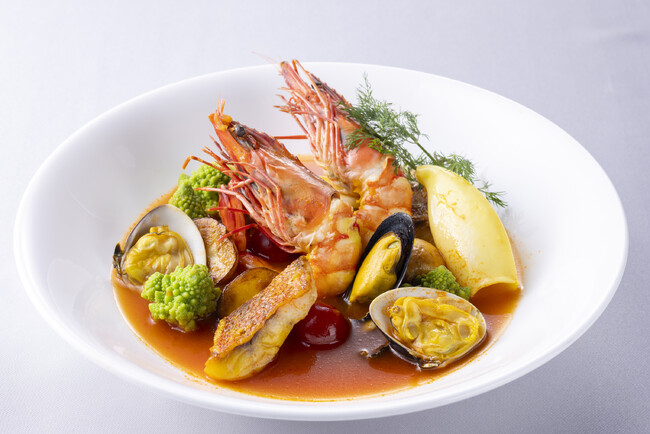 有頭海老をはじめ、ハマグリ、ムール貝などの豊かな海の幸と、旨みが溶け込んだトマトベースのスープ、香り高いサフランなどのハーブを一度に楽しめる一皿です。ご家庭では季節の野菜とともに軽く煮込んで、熱々をお召し上がりください。