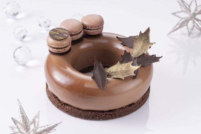 クリスマスリースに見立てたチョコレートムースケーキです。香ばしいキャラメルのブリュレと、さわやかなオレンジのジュレをやさしい味わいのミルクチョコレートムースで包み込みました。忍ばせた甘酸っぱいパイナップルのソテーがチョコレートの美味しさを引き立てます。サクサクとしたカカオのクッキーの食感もお楽しみください。