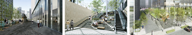 「田町タワーモール」の大きな特徴として、2駅至近の立地と公開空地内に備わる多くの休憩スペースが挙げられます。隣接の「森永ビル」の国道側ペデストリアンデッキに田町タワーのデッキが接続することにより、敷地内に設置された都営線三田駅A5・A6出口(B2Fレベル)からJR田町駅(2Fレベル)までスムーズな動線が確保されます。また、森永ビルを含む「田町駅西口駅前地区」の再開発(2028年度完成予定)に伴い、国道側だけでなくJR側にもデッキが構築され、駅間および地域の歩行者ネットワークが強化される予定です。