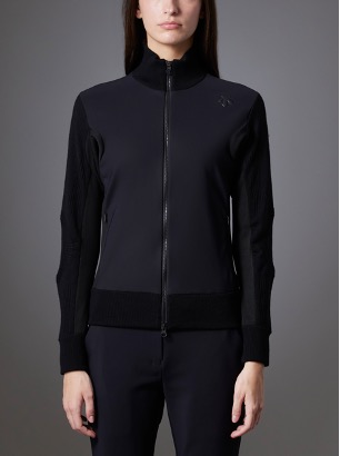 ニットジャケットはウールの中でも最高峰のエクストラファインメリノウールと独自開発の蓄熱保温素材ヒートナビを掛け合わせた素材を開発、上品な光沢感とストレッチ性に特徴のあるウールジャージボンディング素材とハイブリッドされ、柔らかなタッチと高い保温性が特徴。また、毛玉が発生しやすい脇や袖下は毛足がないヒートナビ100%素材で対応。パターンは脇の可動域を広げるアークカットを採用。