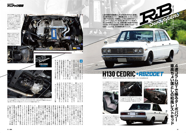 排気量を始め、豊富なバリエーションがあるRBエンジンシリーズに換装することで進化したニッサン旧車。H130セドリック×RB20DET、VPJR30スカイラインエステート×RB25DE、Z31フェアレディZ×RB26DETTという3台のラインアップをお届けする。