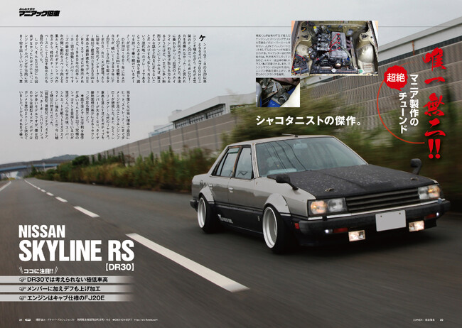 マニアック旧車特集は、プライベーターのこだわりが詰まった渾身の超絶チューンドからスタート。DR30では困難な走れるシャコタン仕様、スタリオン2000GXをベースとするワイドボディ仕様、ワンオフ製作で進化しているジェミニZZ/Rのワイドボディ仕様の3台だ。
