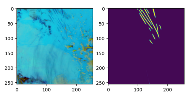 可視化した衛星画像とAIが自動検出した飛行機雲の例を以下に示します。