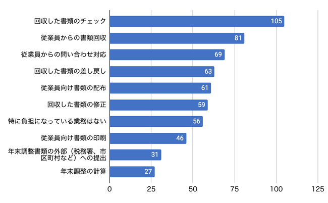 年末調整業務を進める中で負担を感じている項目についての問いでは、「回収した書類のチェック」、次いで「従業員からの書類回収」、「従業員からの問い合わせ対応」が上位となり、書類チェックと回収作業が大きな負担となっていることがわかりました。