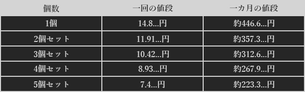 5個セットでは1個分の価格が半額となる6699円(送料込み)で1回(1日)分7.4円と脅威のコスパに。