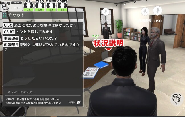 情報セキュリティの責任者であるCISO(Chief Information Security Officer)やCSIRT長・事業部長・広報部長の役割に分かれ、4人一組で各人のPCからメタバースの演習室にアクセスして、約2時間の机上演習を行います。参加者は役割に応じて、提供される状況の情報を元に、発生したインシデントへの対処指示や社内外の関係者への情報連携など、適切な対応を選んでシナリオを進めていきます。普段とは異なる有事の連携・対応を仮想的に経験することで、実際のインシデント発生時の的確な対応につなげることができます。演習終了後には参加者各自の取り組みの結果と評価が提示され、対応の課題や改善点を理解できます。