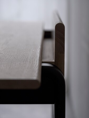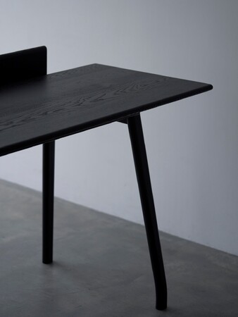 デスクを構成する素材は、天板には木目が美しい北海道産のタモ材、脚部にはなめらかな仕上がりの北海道産のカバ材を使用。テクスチャーの異なる素材、直線的なトップと有機的なレッグデザインの対比がより、軽快さと美しい違和感を醸し出します。
