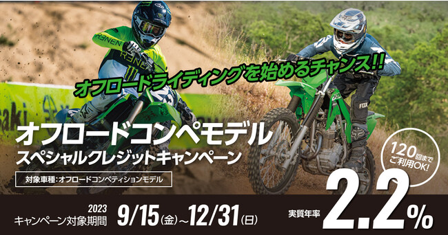 株式会社カワサキモータースジャパン(本社:兵庫県明石市、代表取締役社長:桐野 英子)は、12月31日までにオフロードエントリーショップをはじめとするカワサキ正規取扱店で、カワサキオフロードコンペティションモデル新車ご購入時にご利用いただける、実質年利2.2%の「オフロードコンペモデルスペシャルクレジットキャンペーン」を実施いたします。