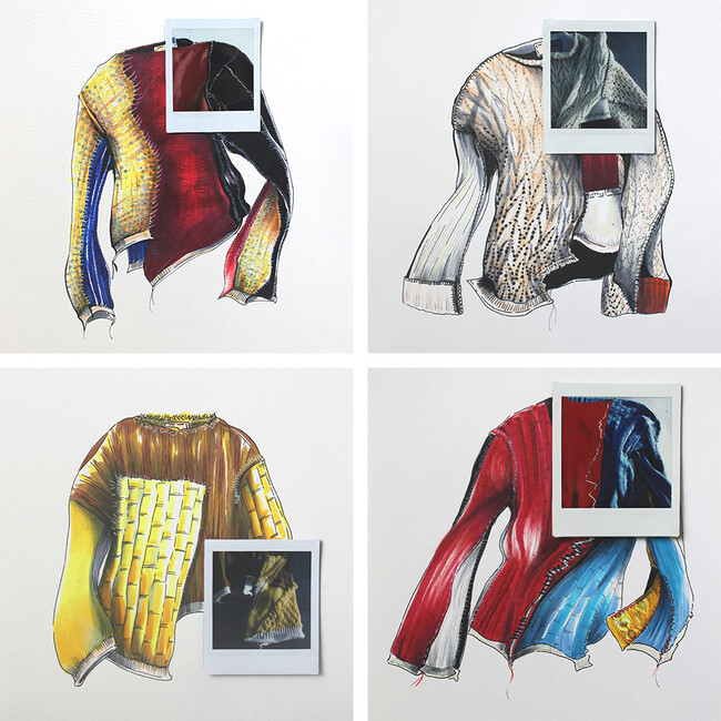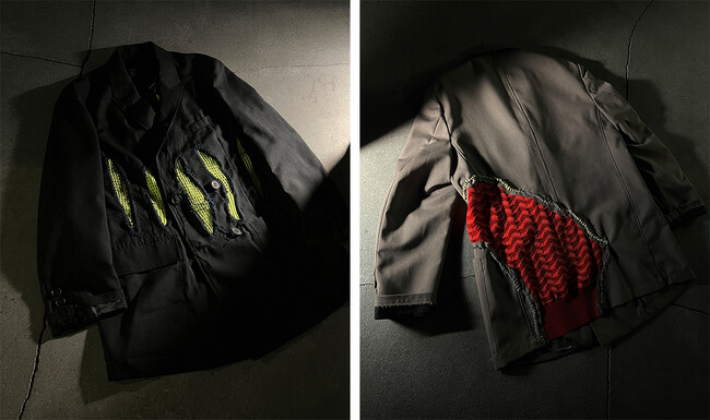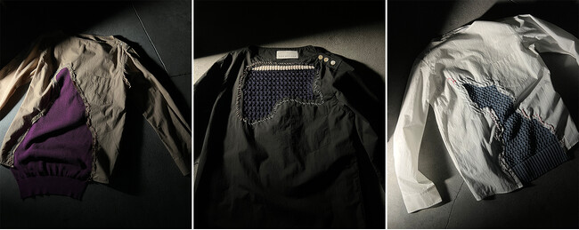 今回のコラボレーションアイテムは、DIET BUTCHER既存のジャケットやプルオーバーシャツやフレアパンツに、ニット工場の余り糸で製作したsonatine特有のニットパーツを大胆に、手作業のかがり縫いでパッチワークしたスペシャルなデザインです。