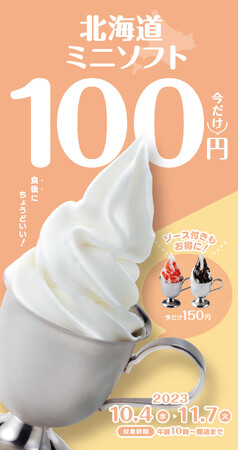 株式会社アレフ(本社:北海道札幌市、代表取締役社長:庄司 大)が展開するハンバーグレストラン「びっくりドンキー」は、10月4日(水)~11月7日(火)の期間限定で、通常価格200円(税込)の「北海道ミニソフト」を100円(税込)で販売します。また、150円(税込)で「北海道ミニソフト イチゴソース」「北海道ミニソフト チョコソース」もお得に愉しめます。(通常価格:250円(税込))