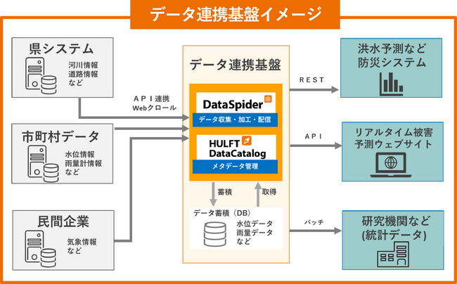 今回の長野県スマートハイランドデータ連携基盤の構築事業では、基盤をDataSpider Servistaを中心に構築し、蓄積された情報のメタデータをHULFT DataCatalogによって自動収集してカタログ化することで情報を可視化しています。