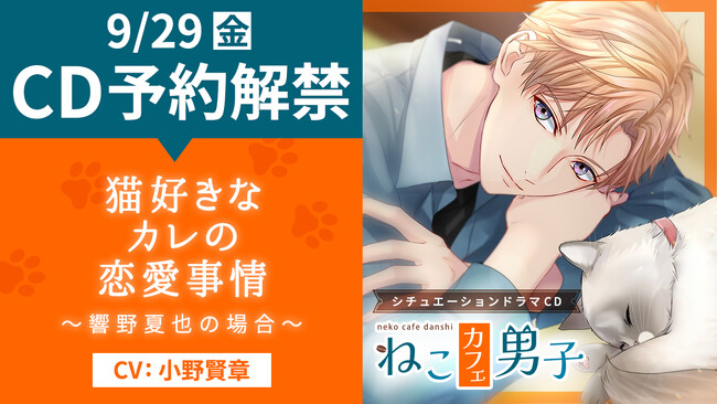 株式会社ボルテージ(本社:東京都渋谷区 代表取締役:津谷 祐司)は、ボル恋シチュエーションドラマCD「ねこカフェ男子 猫好きなカレの恋愛事情 ~響野夏也の場合~」の予約受付を9月29日(金)より開始したことをお知らせいたします。