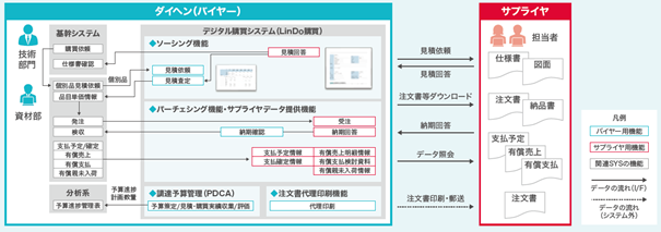 TISはこれらの要望を受けて開発を進め、ダイヘンの用途に最適化した標準の見積テンプレートを提供しました。この作業と並行して、TISでは「LinDo購買」と基幹システムを連携させる開発に着手し、2021年9月、第1段階として見積依頼や回答を受け持つ「ソーシングシステム」が完成しサービスインを迎えました。続いて2022年10月には、購買依頼・発注・受入等を担う「パーチェシングシステム」を始動させています。