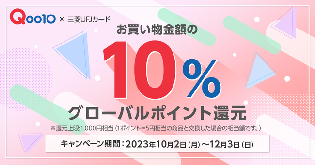 三菱UFJニコスは10月2日から12月3日まで、Mastercard(R)・Visa・JCBブランドの三菱UFJカードの個人会員(一部を除く)を対象に、ファッションや化粧品・美容品、食品、書籍など幅広い商品を取り扱うインターネット総合ショッピングモール「Qoo10(キューテン)」での期間中合計5,000円以上の利用で、もれなく1,000円につき10%相当のポイント(上限200ポイント/1,000円相当※)が基本ポイントに上乗せされるキャンペーンを実施します。