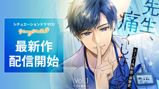 「先生、痛くしないで」は、シチュエーションドラマCDレーベル「Honey Mellow」の人気作「アオハルRe:プレイ」に続く新シリーズで、院内恋愛をテーマにお医者さんである彼が仕事に向き合う姿と、変わっていく二人の関係がお楽しみいただけます。