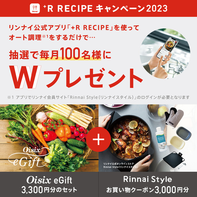 「+R RECIPE」から「Rinnai Style」にログインしてください。エントリーフォームからキャンペーンに応募し、「+R RECIPE」対応コンロでオート調理してください。