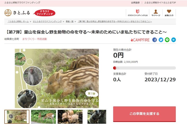 岐阜県七宗町とふるさと納税ポータルサイト「さとふる」(https://www.satofull.jp/)を運営する株式会社さとふる(本社:東京都中央区、代表取締役社長 兼 CEO:藤井 宏明)は、「さとふるクラウドファンディング」(https://www.satofull.jp/projects/top.php)にて、「【第7弾】里山を保全し野生動物の命を守る~未来のためにいま私たちにできること~」の寄付受け付けを2023年10月2日より開始します。