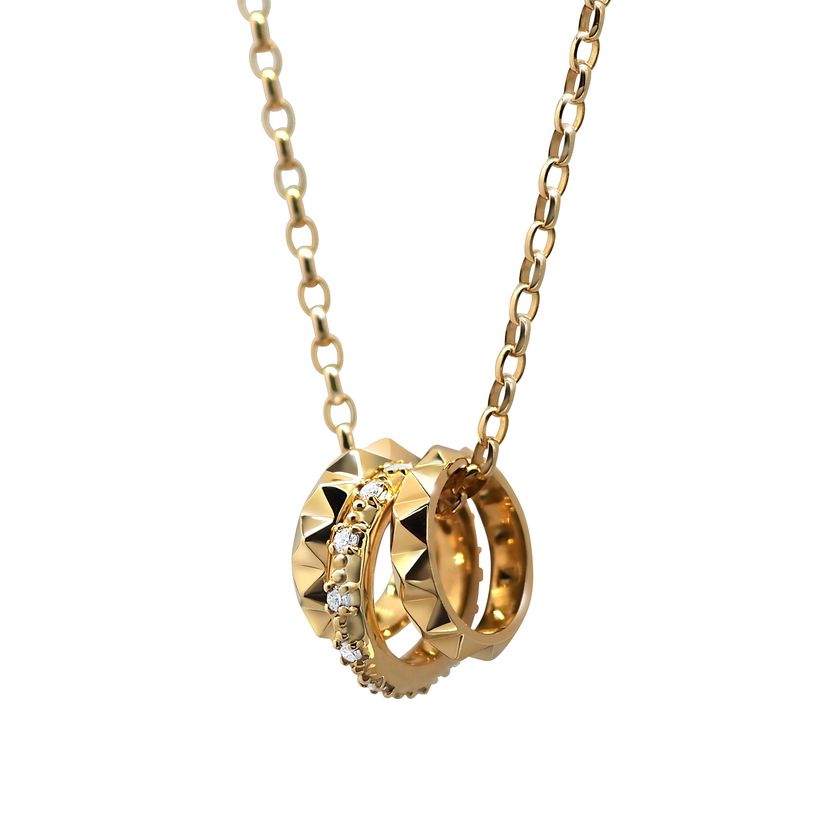 古くから縁起が良いとされる数字の“3”にちなんだTHREE COLLECTIONより、ダイヤモンドを1周あしらったフルエタニティデザインのロンデルを、ダイヤモンドシェイプモチーフのロンデルで挟み込んだラグジュアリーなペンダントトップが登場。ダイヤモンドの輝きと多面に光を受ける立体的なフォルムが胸元でさりげなく煌めきます。それぞれ単体でも使用できるので、スタイリングに合わせて組み合わせを変えることが出来、パートナーとのシェアも愉しめるのもポイント。