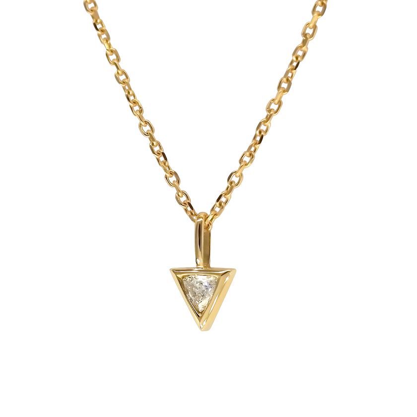 三角形状にカッティングするファンシーカットの1つ“トリリアントカット”を施したダイヤモンドをセットしたミニマルでラグジュアリーなペンダントトップ。1粒ダイヤのペンダントでありながら、高品質なダイヤモンドだからこそ成しえる、透明感のあるシャープな輝きはユニセックスでお使いいただけるアイテムです。