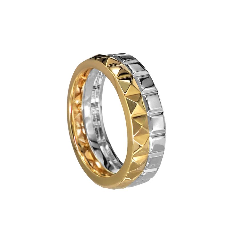 ロウダイヤモンドコレクションより、ダイヤモンドシェイプモチーフのリングとスクエアカットモチーフのリングをスタッキングしたボリューム感のある2連リングが登場。フルエタニティデザインの多面が光を受けて手元をエレガントに彩ります。キュリオシティコレクションのリングとの重ね着けもオススメです。