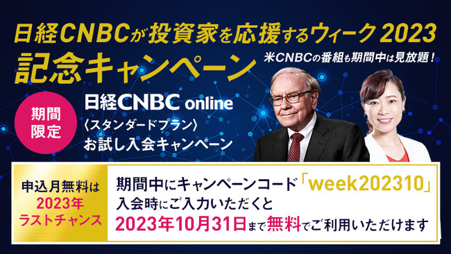 「日経CNBC online」を無料でお試し体験できるキャンペーンを10月1日(日)に開始しました。キャンペーン期間中(2023年10月31日までのご入会)にキャンペーンコードを入力のうえ新規お申し込みいただくと、10月のご利用が無料となります。