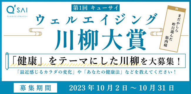 キューサイ株式会社(本社:福岡市中央区、代表取締役社長:佐伯 澄)は、創業58周年を迎える10月を機に、『第1回キューサイウェルエイジング川柳大賞』への募集を開始いたします。第1回となる今回は「健康」をテーマに、健康法や日々感じるカラダの変化などについて、親しみやすい川柳という形式で募集し優秀作品の作者には豪華賞品をプレゼントいたします。当社は本キャンペーンを通じて、ご自身の健康を考え共有していただくことで、当社の企業ミッションである “ウェルエイジング”という考え方を知っていただくきっかけづくりをしたいと考えます。