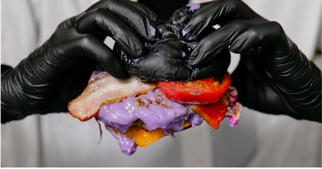 バブルスバーガーといえばカラフルなバンズ!ハロウィン限定メニューでは、黒いバンズに、ハロウィンカラーのたっぷりの具材を挟んだハンバーガーを、黒い手袋で豪快にお召し上がりください!