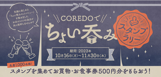 COREDO室町では、「COREDOでちょい呑み」と題して、スタンプラリーを開催いたします。対象店舗のスタンプを3つ集めると、先着1,000名様にお買物・お食事券500円分プレゼント。