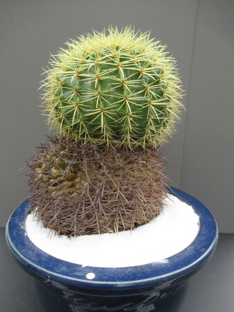 一度は成長が止まって枯れかけたのに、その後七転び八起きのダルマのように見事に復活!改めて成長を開始したため、上の部分が生き生きとしている一方で、下の部分が味わい深く枯れた様になっているアンバランスな姿が個性的なサボテンです。