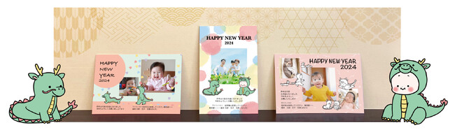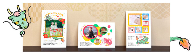 のだかおりさん特有の温かなタッチに癒されるイラストデザインは、写真枠数の多いデザインも揃えており、複数写真を入れたい方にオススメです。また、テイストの異なるオシャレな辰のイラストから選べます。
