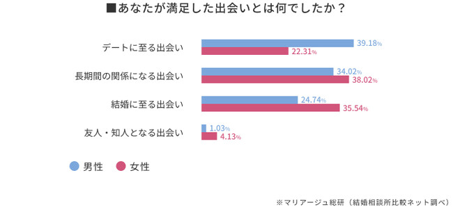 満足のいく出会いがあったと回答した人に、「満足した出会いとはどんな出会いか」を尋ねたところ、その回答に男女で大きな違いが見られました。