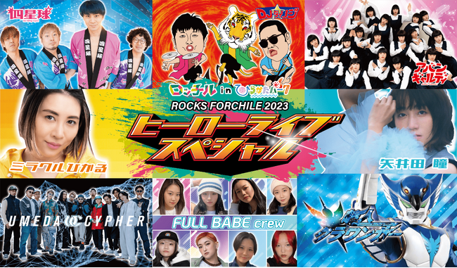 みんながワクワク夢をみることができる社会の実現を目指す株式会社RFC(アールエフシー、大阪府豊中市、代表取締役:伊吹 美里、以下RFC)は、新しい形のヒーローフェス「ロッチル in ひらかたパーク(ROCKS FORCHILE2023)」(以下ロッチル、 URL: https://rocksforchile.com/)を11/23(木・祝)~25(土)の3日間、ひらかたパーク(大阪府枚方市)で開催します。今回のコンセプトは『ヒーロー大集合』。この度、第二弾ヒーロー(出演アーティスト)として11月25日(土)に梅田サイファー、DJダイノジ、FULL BABE crew、11月23日(木・祝)に超人クラワンガーの出演が決定しました。また、本日より矢井田 瞳とのコラボレーションでステージを盛り上げる「キッズバックダンサー」と、ロッチルの企画を一緒に考え、実行する「子ども実行委員」の募集も開始します。